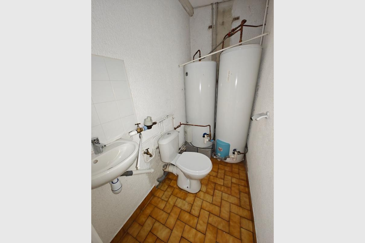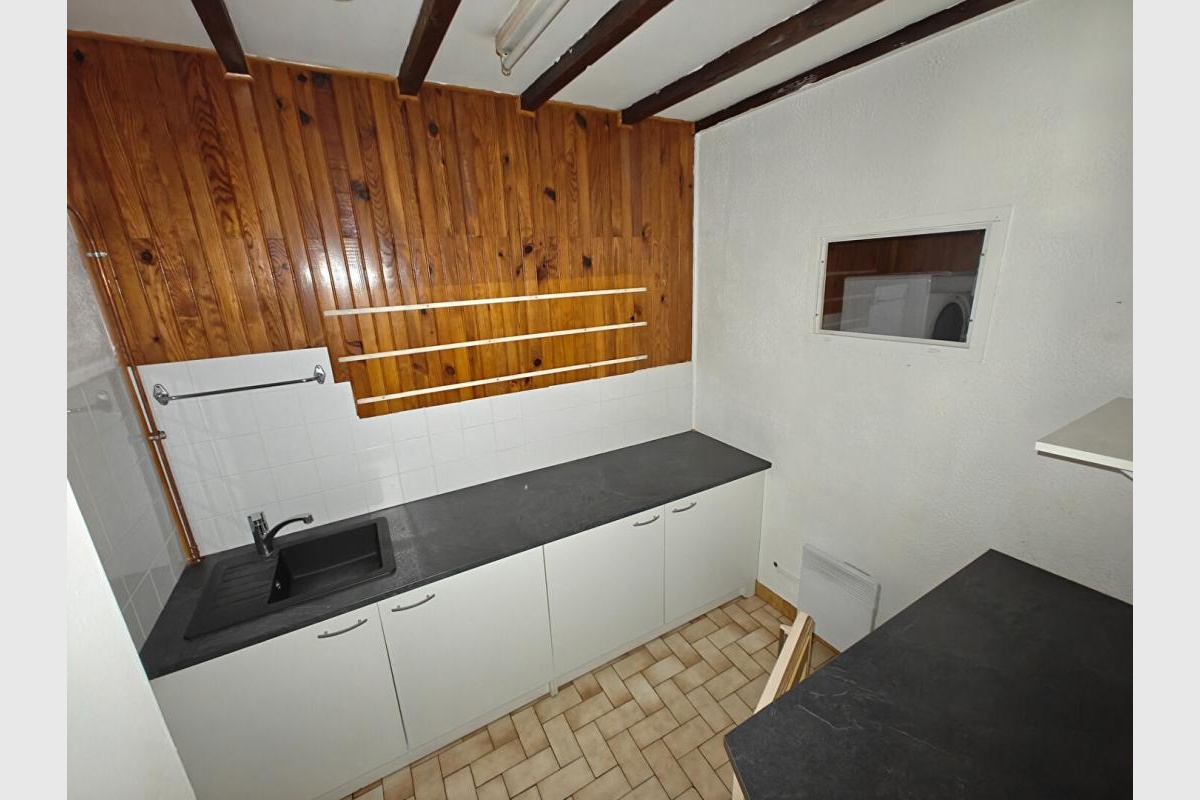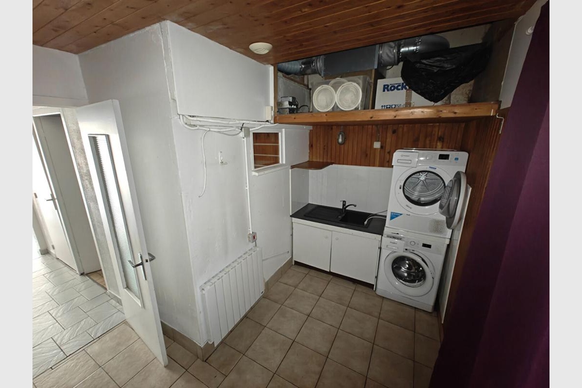 Grande salle lumineuse, cuisine équipée, pièce arrière avec point d’eau, lave-linge et sèche-linge.