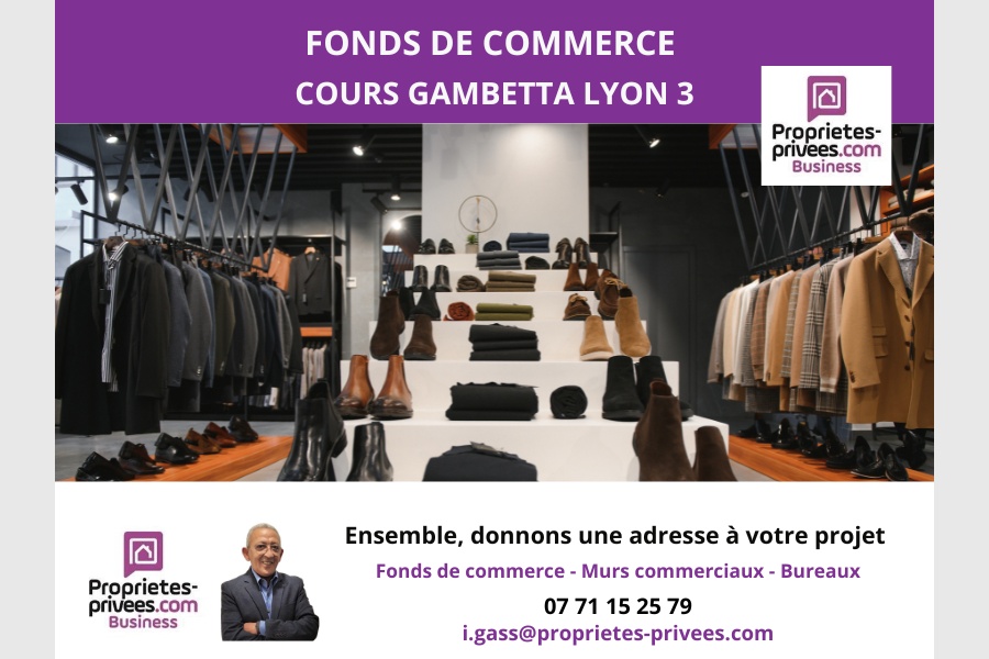Idriss Gass vous propose à la vente un fonds de commerce dédié à la vente de costumes et chaussures pour homme, situé sur le très passant Cours Gambetta, au coeur du 3éme arrondissement de Lyon.