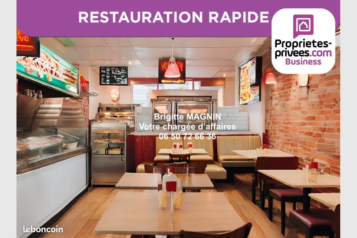 Brigitte MAGNIN vous propose ce restaurant rapide exploité depuis des années, avec un four à pizza, idéal pour une pizzeria, poulet braisé, plats italiens et toute autre restauration, avec16 couverts en salle et 6 places assises en terrasse mais d’avantage si vous le souhaitez. Le restaurant s’ouvre sur la rue par des baies vitrées amovibles qui sont protégées par un rideau métallique. Il est équipé d’une EXTRACTION 400 aux normes, d’un four à pizza, une table à pizza réfrigérée, deux saladettes dont une réfrigérée, une gazinière pro deux feux et d’autres matériels professionnels, gaz et électricité triphasé aux normes.