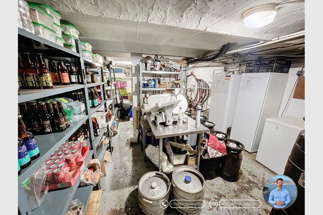– Vaste espace de stockage d’environ 30 m² avec extraction d’air et tirage pour 14 becs (dont eau plate et gazeuse).