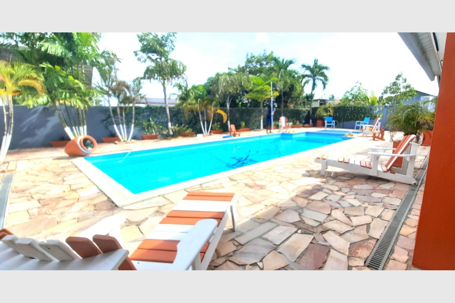 La clientèle peut profiter d’une très belle piscine au sel : 12 m x 5 m (profondeur maximum de 1.90 m), d’espaces détentes paysagés, salle de sport, portail automatique pour l’accès parking 9 places sécurisés avec éclairage. Complexe clos de murs avec caméra de surveillance, sans aucun vis-à-vis de 1 892 m2 de terrain.
