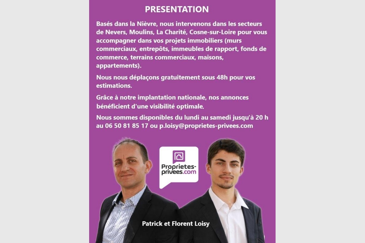 Cette présente annonce a été rédigée sous la responsabilité éditoriale de PATRICK LOISY agissant sous le statut d’agent commercial immatriculé au RSAC nevers 503 140 766 auprès de la SAS PROPRIETES PRIVEES, au capital de 44 920 euros, ZAC LE CHÊNE FERRÉ – 44 ALLÉE DES CINQ CONTINENTS 44120 VERTOU; SIRET 487 624 777 00040, RCS Nantes. Carte professionnelle Transactions sur immeubles et fonds de commerce (T) et Gestion immobilière (G) n° CPI 4401 2016 000 010 388 délivrée par la CCI Nantes – Saint Nazaire. Compte séquestre n°30932508467 BPA SAINT-SEBASTIEN-SUR-LOIRE (44230) ; Garantie GALIAN – 89 rue de la Boétie, 75008 Paris – n°28137 J pour 2 000 000 euros pour T et 120 000 euros pour G. Assurance responsabilité civile professionnelle par MMA Entreprise n° de police 120.137.405