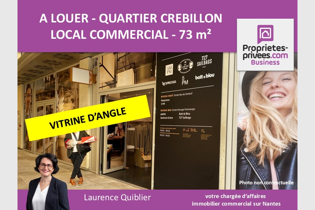Laurence QUIBLIER vous propose à NANTES CENTRE-VILLE, quartier Crébillon, un local commercial récent de 73 m², au sein du Passage Coeur de Nantes. Avec son architecture contemporaine faite de verre, métal et bois, le Passage Coeur communique harmonieusement avec le célèbre passage Pommeraye, bâtiment classé. Dotée d’un linéaire vitrine d’angle + de 10 m et aspectant la rue, cette cellule commerciale est partiellement aménagée, climatisée avec sanitaires PMR. Elle dispose des accès ERP et PMR, sur un site sécurisé et gardienné, avec RIA et sprinklage. Le quartier est largement desservi par les tramways et bus, traversant deux des artères les plus commerçantes du centre-ville de Nantes, sur un positionnement plutôt CSP +. Loyer 40150 euros HT HC par an, honoraires locataire 25 % HT du loyer annuel HT HC, hors frais de rédaction de bail et de gestion technique. Pour visiter et vous accompagner dans votre projet contactez Laurence QUIBLIER au 06.81.78.46..21 ou par courriel à l.quiblier@proprietes-privees.com. Cette présente annonce a été rédigée sous la responsabilité éditoriale de Laurence QUIBLIER agissant en tant que Chargée d’affaires indépendante auprès de la SAS PROPRIETES PRIVEES. Mandat réf : 396077. En tant que professionnelle, je vous conseille et sécurise votre projet d’installation. SAS PROPRIETES PRIVEES – ZAC du chêne ferré – 44 allée des cinq continents 44120 VERTOU, Carte professionnelle CPI 4401 2016 000 010 388 CCI Nantes-Saint Nazaire. RCS NANTES 487 624 777