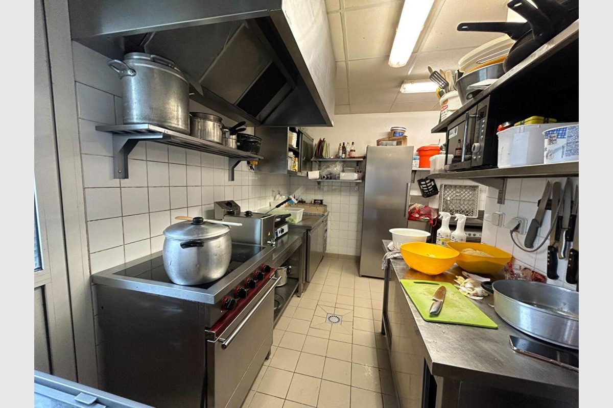 Équipements : Four à pizza moderne, comptoir de service, espace de stockage, cuisine bien équipée.