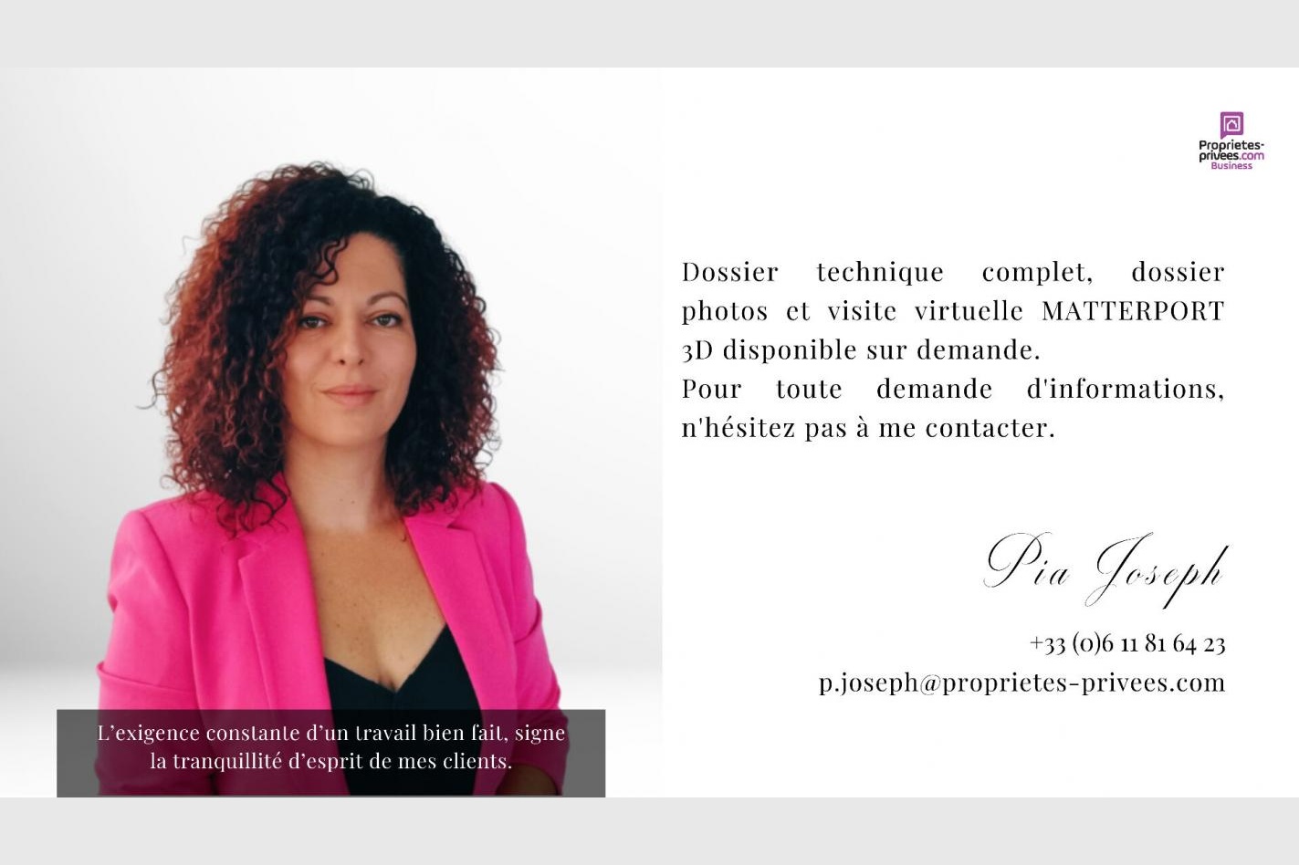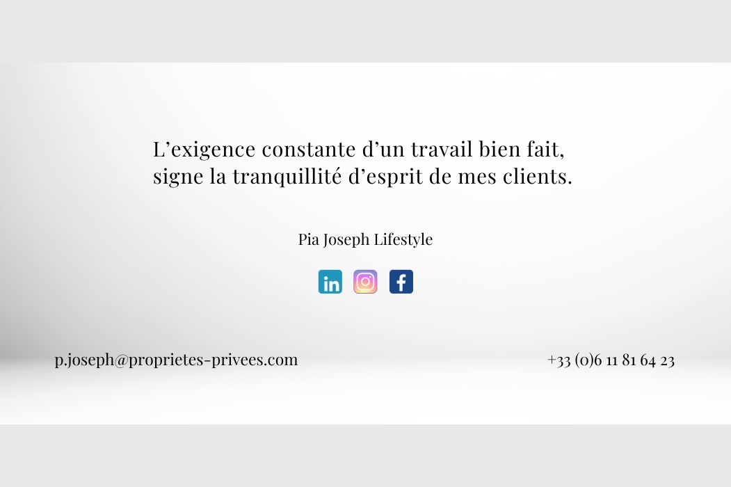 Pour visiter et vous accompagner dans votre projet, contactez Pia JOSEPH, au 0611816423 ou par courriel à p.joseph@proprietes-privees.com