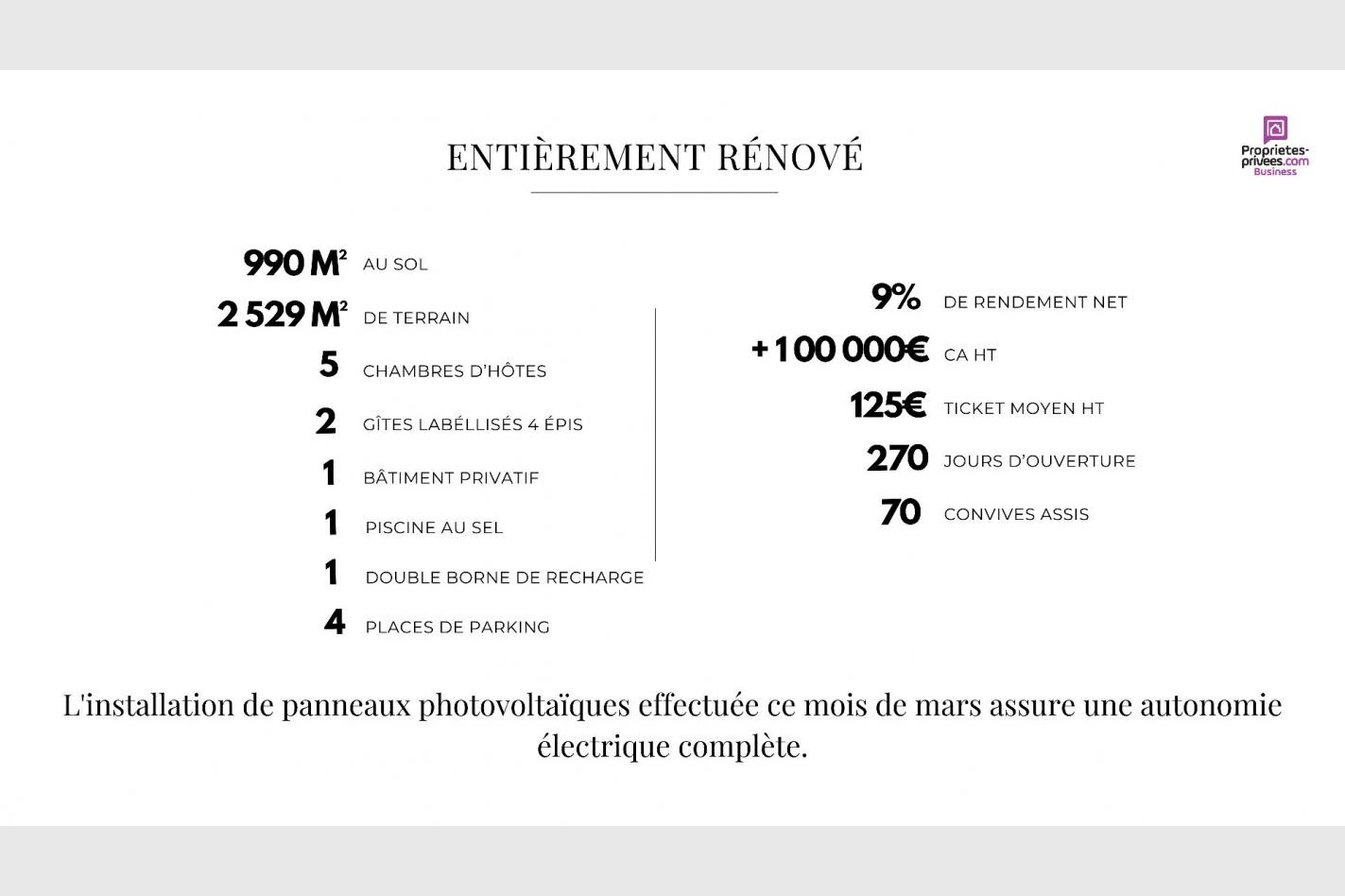 1. Espace d’Exception : Un lieu enchanteur de plus de 990 m² au sol, entièrement rénové et équipé, incluant un espace privatif, 5 chambres d’hôtes et 2 gîtes labellisés 4 épis. La belle hauteur sous plafond ( environ 7 m), les poutres apparentes et la pierre confèrent à ce lieu toute sa Majesté, créant une ambiance chaleureuse et raffinée.
