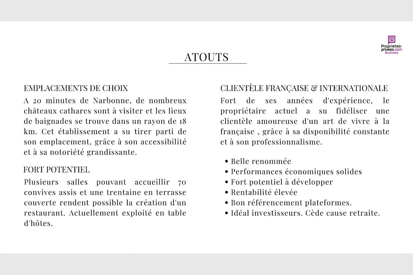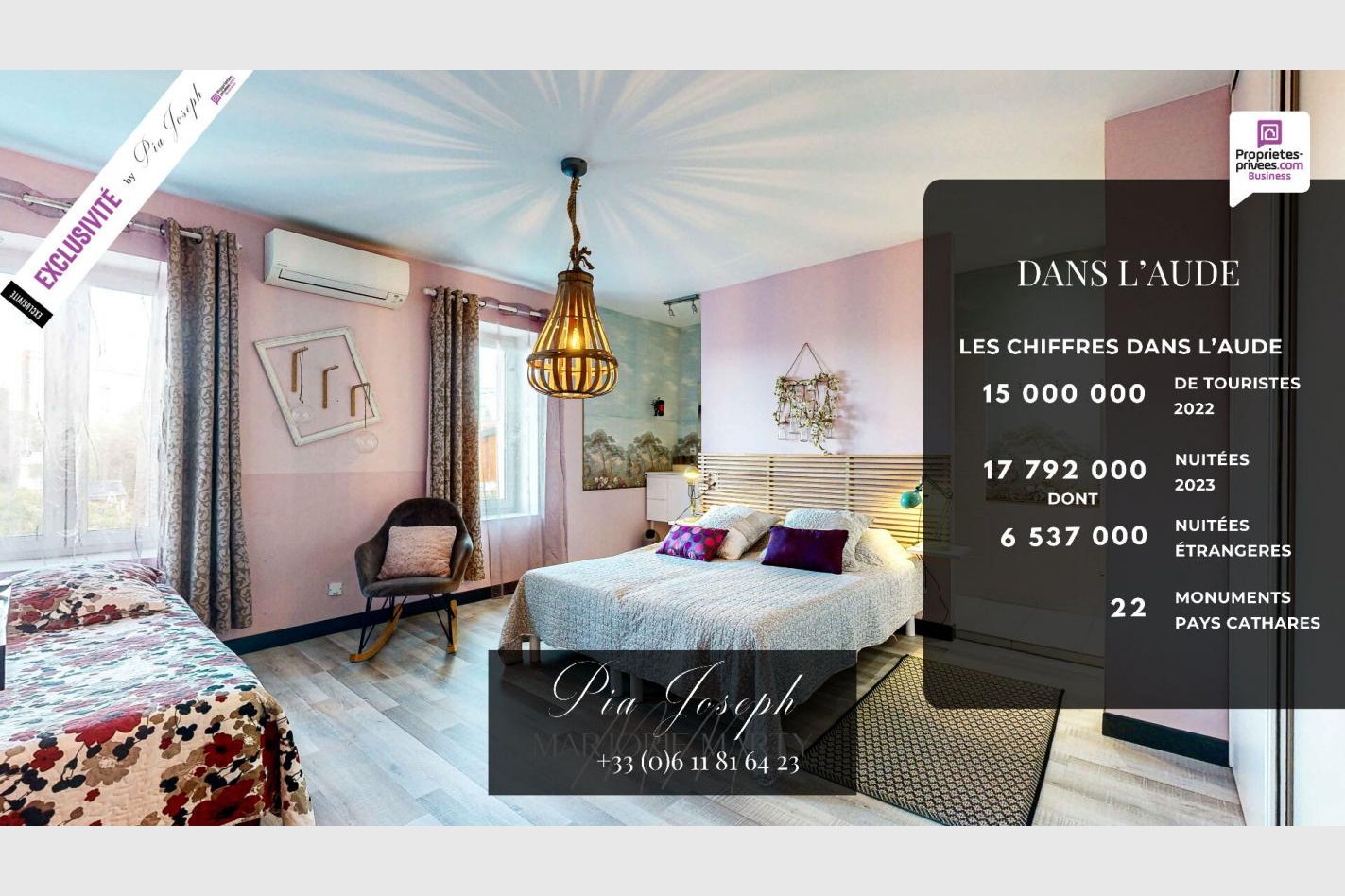 Cette présente annonce a été rédigée sous la responsabilité éditoriale de Pia JOSEPH agissant sous le statut d’agent commercial immatriculé au RSAC CARCASSONNE 824 002 638 auprès de la SAS PROPRIETES PRIVEES, au capital de 40 000 euros, ZAC LE CHÊNE FERRÉ – 44 ALLÉE DES CINQ CONTINENTS 44120 VERTOU; SIRET 487 624 777 00040, RCS Nantes.
