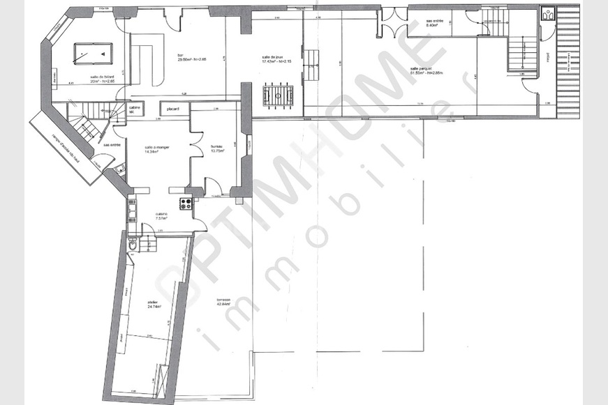 RdC : Bar (47 m²), Salle de billard (20 m²), Salle avec parquet (60 m²), Salle à manger, Cuisine, Atelier / Laboratoire, Terrasse, Bureau, Sanitaires, Préau.