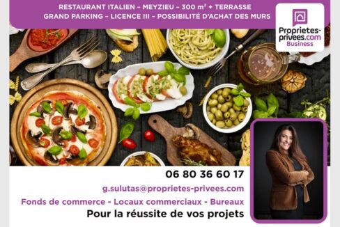 MEYZIEU – RESTAURANT 300 m² + TERRASSE, GRAND PARKING, LICENCE III – POSSIBILITÉ D’ACHAT DES MURS