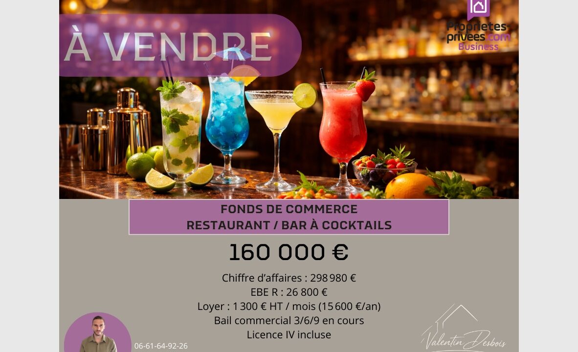 Morad MEZDOUR vous propose à la vente le fonds de commerce de ce BAR d’AMBIANCE situé à deux pas du parc Jean Baptiste Lebas. – Surface : 150 m² avec 50 places répartis en deux salles. – Potentiel évident : Déjà une bonne réputation, possibilité de développement. Chiffres clés attractifs : – Loyer faible :…
